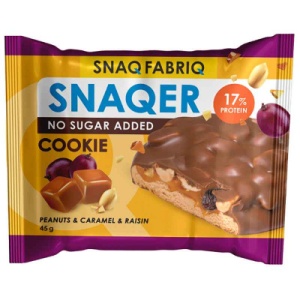 Snaqer Cookie – это печенье без сахара. Вместо ненужных быстрых углеводов оно богато белком, который поможет сохранять белковый баланс, наращивать мышцы и поддерживать организм в отличной форме. Хрустящая основа печенья полита ароматной тягучей карамелью. Сверху много-много обжаренного арахиса и мягкого сладкого изюма. И всё это со всех сторон покрыто нежнейшим, тающим во рту, завораживающим шоколадом Snaq Fabriq.