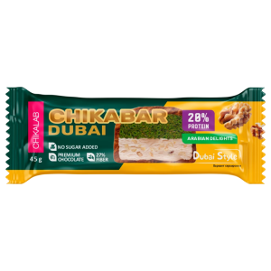 Chikalab Dubai 45 g — это вкусный и полезный протеиновый батончик с восточной ноткой, сочетание натуральных ингредиентов и лёгкой энергетической формулы делает его отличным выбором для перекуса в пути, на тренировке или в путешествиях.