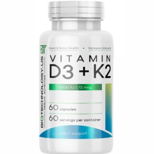 Витаминный комплекс Vitamin D3+K2 от Biotechnology.us разработан с учётом мировых рекомендаций от ведущих экспертов в области здоровья. Строгий контроль на всех этапах производства гарантирует качество продукта, что подтверждает GMP сертификат. Достаточно принимать по 1 капсуле ежедневно, чтобы восполнить нехватку этих двух важных для здоровья витаминов и поддерживать их оптимальный уровень ежедневного поступления.